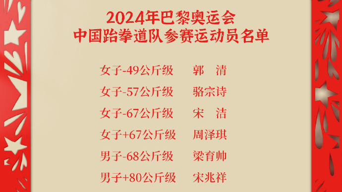 此次获得参加巴黎奥运会的6名中国跆拳道队选手分别是女子-49公斤级的郭清、女子-57公斤级的骆宗诗、女子-67公斤级的宋洁、女子+67公斤级的周泽琪以及男子-68公斤的梁育帅和男子+80公斤级的宋兆祥。