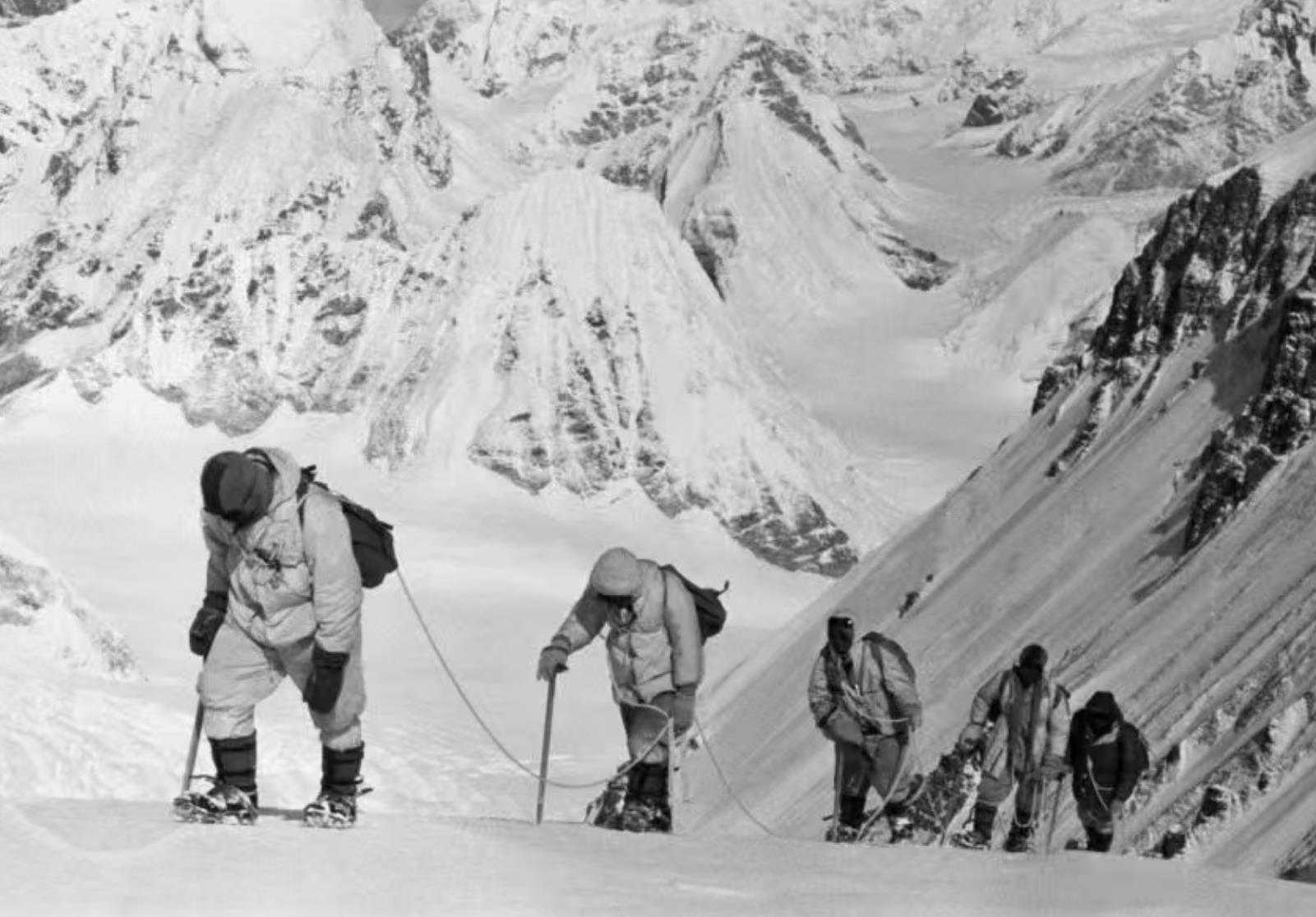 于是,就有了最终的登顶壮举。王富洲、屈银华、贡布,还有刘连满,他们一起登到了第二台阶,这是海拔位于8680至8710米的岩石地带,有一块近乎垂直,高度在20至30米之间的岩石。由于异常险要,被称为“连飞鸟也无法逾越的地方”。更为艰难的是,那块岩石几乎没有裂缝,岩锥找不到切入口。