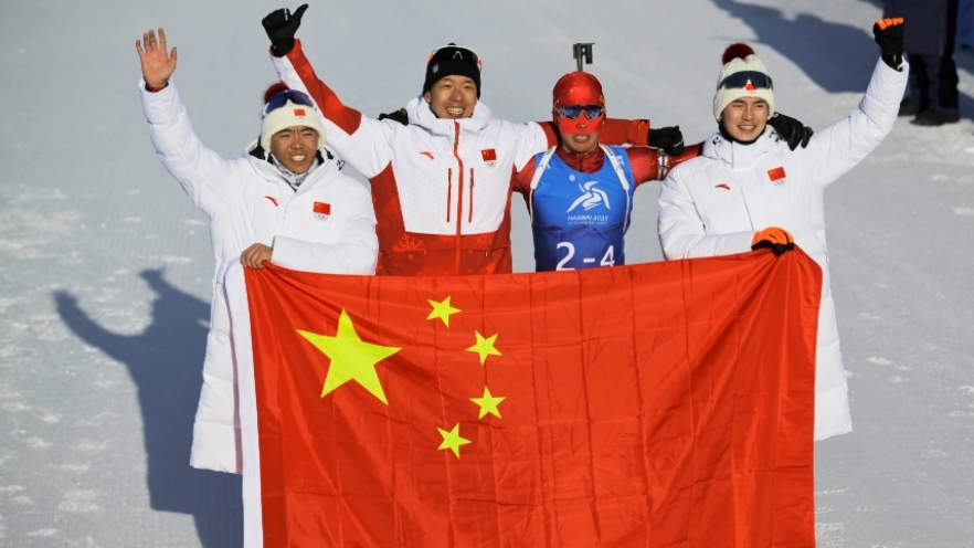 当孟繁棋第一个冲过终点,瘫倒在地,已结束比赛在终点等候的三位姑娘唐佳琳、文颖、褚源蒙,扶她起身,为她披上羽绒服。她们接过五星红旗,此时在赛场边的教练、领队、工作人员齐声高唱《歌唱祖国》。领先、落后、追赶、反超,中国队最终以1小时29分06秒3的成绩逆转取胜。逆风翻盘,顽强拼搏,姑娘们用不抛弃不放弃的精神,用胜利奏响属于中国冬季两项的凯歌。
