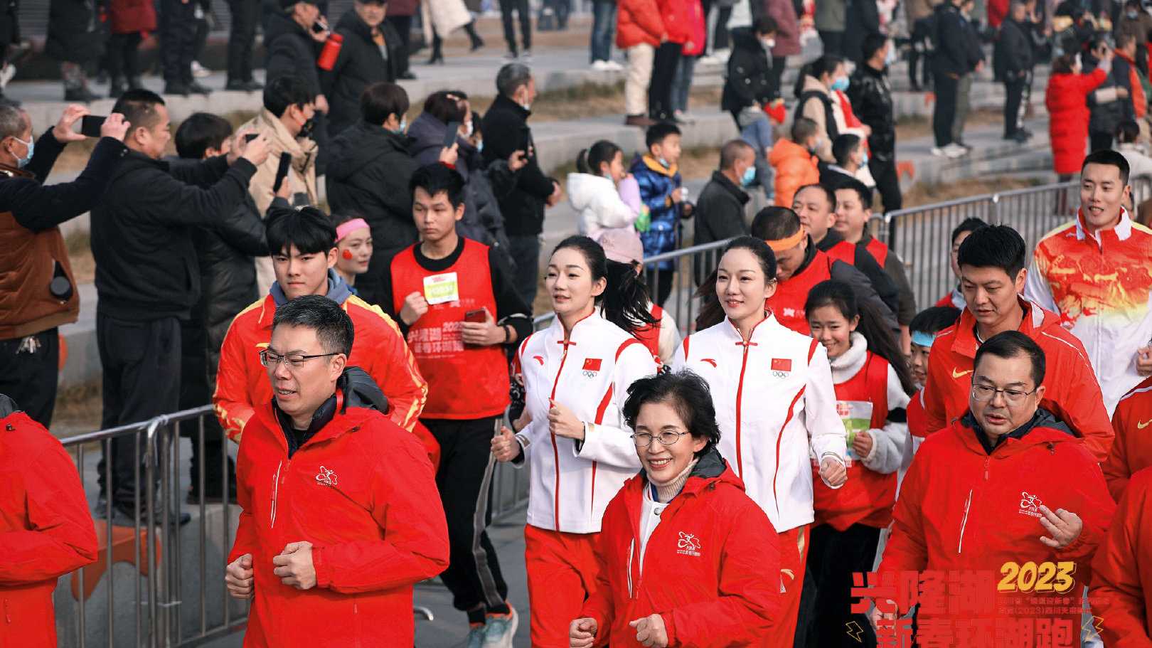 大年初一10时,成都天府新区兴隆湖热闹非凡,数千名群众和花样游泳世界冠军蒋婷婷、蒋文文,皮划艇世界冠军赵晓俐,武术散打世界冠军吴强等川籍冠军运动员一起,用8.8公里环湖跑迎接新年的到来。